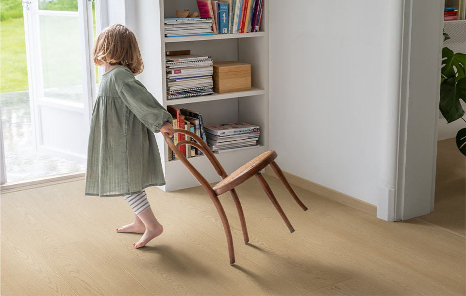 Nhà tôi có trẻ nhỏ và thú cưng nhưng sàn Pergo vẫn giữ được độ bền tốt. Việc vệ sinh cũng rất dễ dàng.