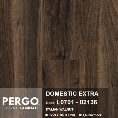 Pergo Laminate Domestic Extra 02136 là sàn gỗ công nghiệp bền bỉ thuộc dòng Domestic Extra của Pergo, phù hợp cho cả nhà ở và các không gian như văn phòng, showroom. Sản phẩm đạt chuẩn Class 32/AC4, tích hợp lớp phủ TitanX™ chống trầy xước và hèm khóa Uniclic® giúp lắp đặt nhanh chóng. Mẫu 02136 nổi bật với tông nâu trung tính pha nâu ấm tự nhiên, vân gỗ chân thực với độ tương phản nhẹ, mang lại cảm giác sang trọng, ấm cúng và dễ phối với nhiều phong cách nội thất.