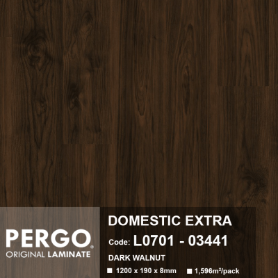 Pergo Laminate Domestic Extra 03441 là sàn gỗ công nghiệp bền bỉ thuộc dòng Domestic Extra của Pergo, phù hợp cho cả nhà ở và các không gian như văn phòng, showroom. Sản phẩm đạt chuẩn Class 32/AC4, tích hợp lớp phủ TitanX™ chống trầy xước và hèm khóa Uniclic® giúp lắp đặt nhanh chóng. Mẫu 03441 nổi bật với tông óc chó trầm ấm cùng vân gỗ tự nhiên sắc nét, mang lại cảm giác sang trọng, ấm cúng và tinh tế cho không gian.